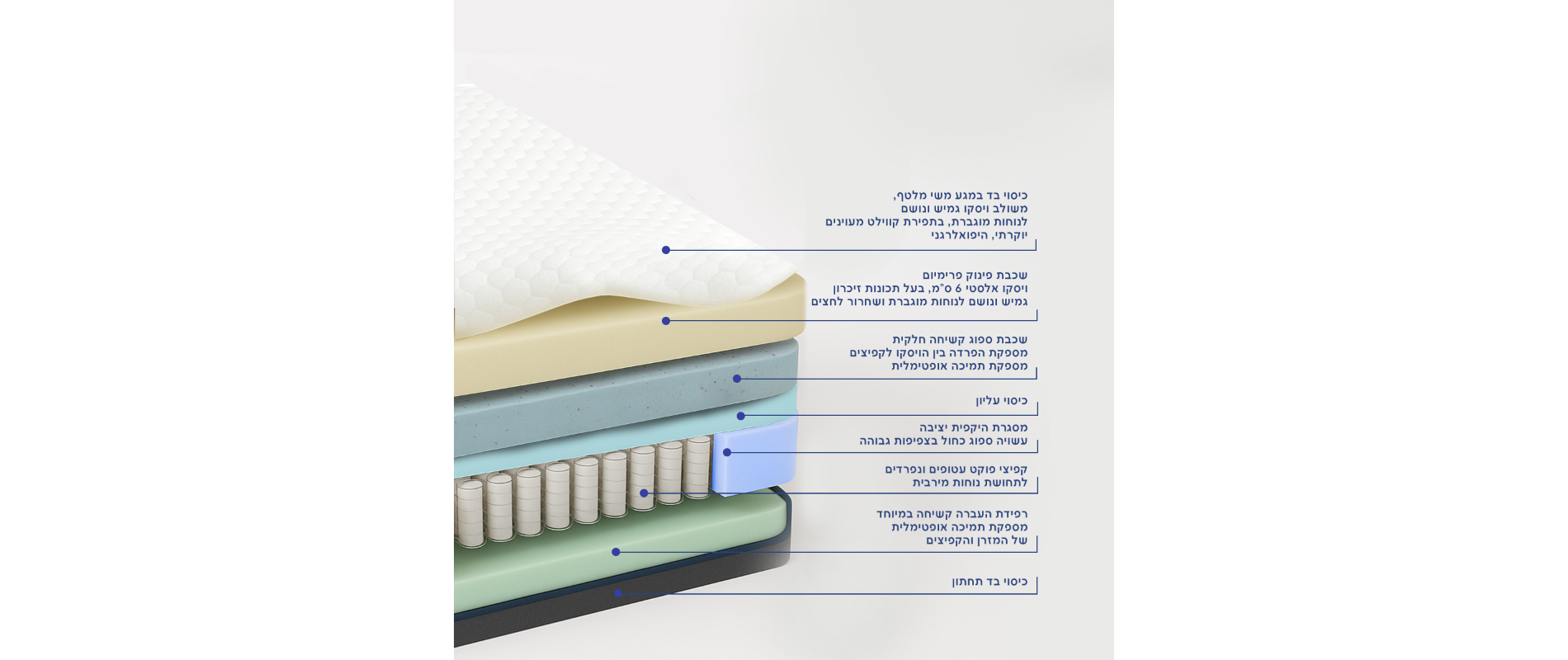 שכבת פינוק פרימיום ויסקו אלסטי 6 ס"מ גמיש ונושם, בעל תכונות זיכרון המספקת תמיכה מוגברת לעמוד השדרה ושחרור לחצים, לשינה עמוקה ורציפה
